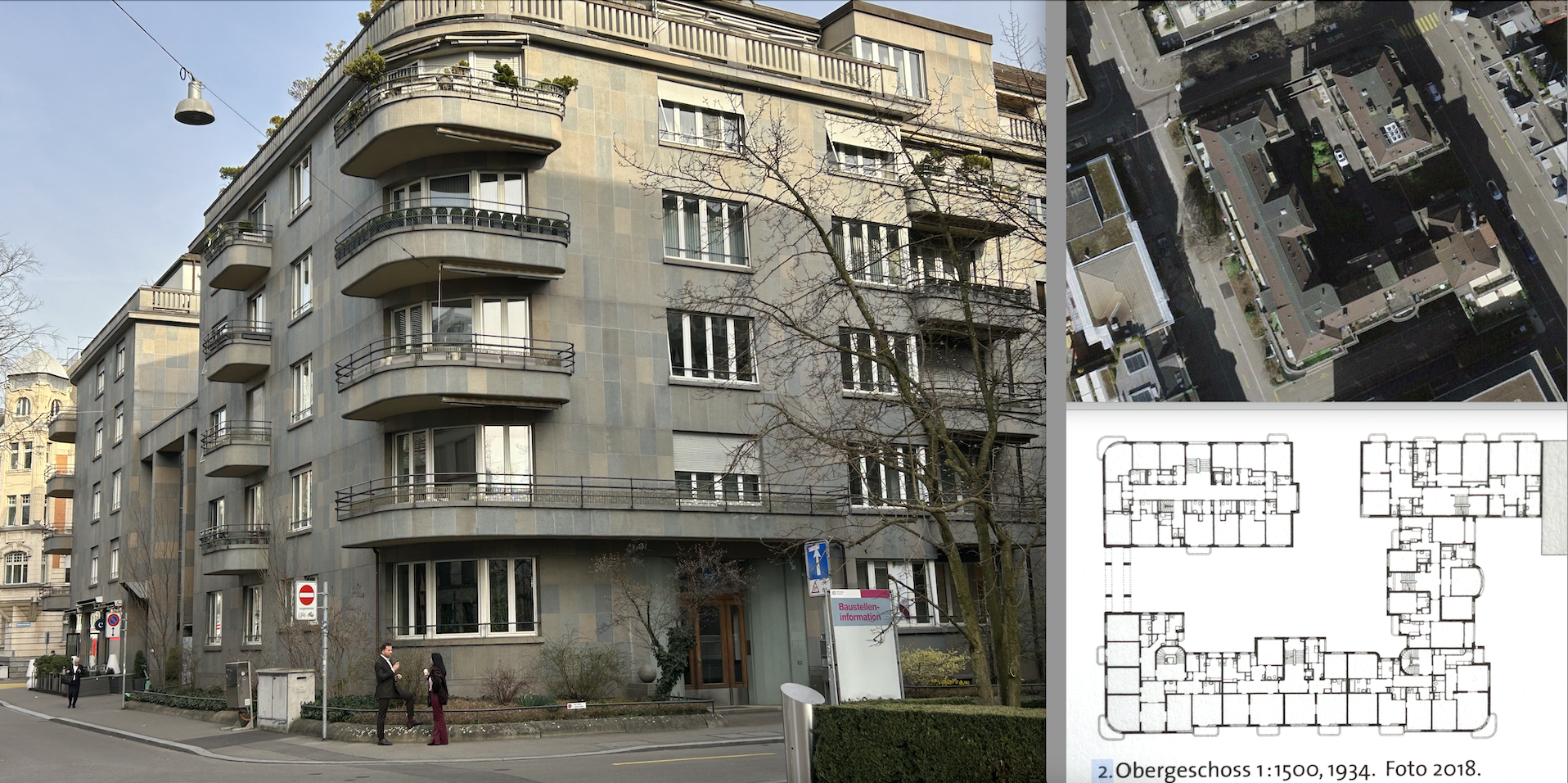 «Neues Schloss» heisst die 1934 erstellte Blockrandbebauung zwischen der Stocker- und der Tödistrasse. Sie besetzt die Hälfte des Baublocks und nimmt die Tradition der noblen Schlösser, dem Roten und dem Weissen aus den 1890er Jahren nach Jahrzehnten wieder auf. «Modern» ist das «Apartment House» im freistehenden Eckbau. Einen herrschaftlichen Ton bringt der drei Etagen hohe im Bild gerade noch sichtbare Torbau. Diese im Charakter urbane Aktion stellt sich der Stadtflucht des Wohnens – dem Einfamilienhaus für das gesunde Aufwachsen der Kinder – als stolze Alternative entgegen. Einer ähnlichen Regung folgt das Wohnhotel «Frascati» am rechten Seeufer.
