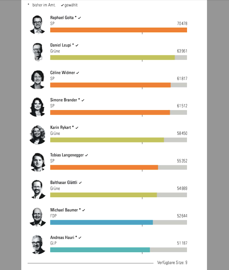 Unser erwartungsvoller Blick geht auf die gewählten Stadtratskandidaten. Wir stellen fest, dass unser Wunschkandidat für das Hochbaudepartement, Tobias Langenegger, gewählt worden ist, und zwar nicht knapp, wie erwartet, sondern mit Reserve auf Platz 6 von 9.