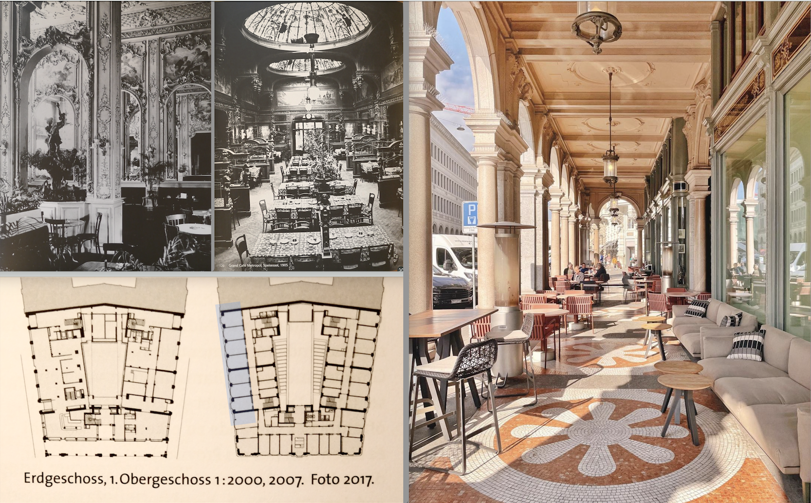 Eine Bayerische Bierstube und ein Café wirkten nach aussen zu den Trottoirs hin und ein überhohes Restaurant möblierte den Innenhof. Dieser wäre bei 6 Etagen auf Strassenniveau unten zu eng geworden. Daraus können wir eine komplexe in jeder Hinsicht durchoptimierte «Maschine» erkennen. Nach der vorletzten Jahrhundertwende liess mit den zwei grossen Kriegen wahrscheinlich Konjunkturpech das aufwendige Metropol zurückfallen. Es wurde verspekuliert und schlussendlich von der Stadt aufgekauft und inzwischen mehrfach vorbildlich renoviert.
