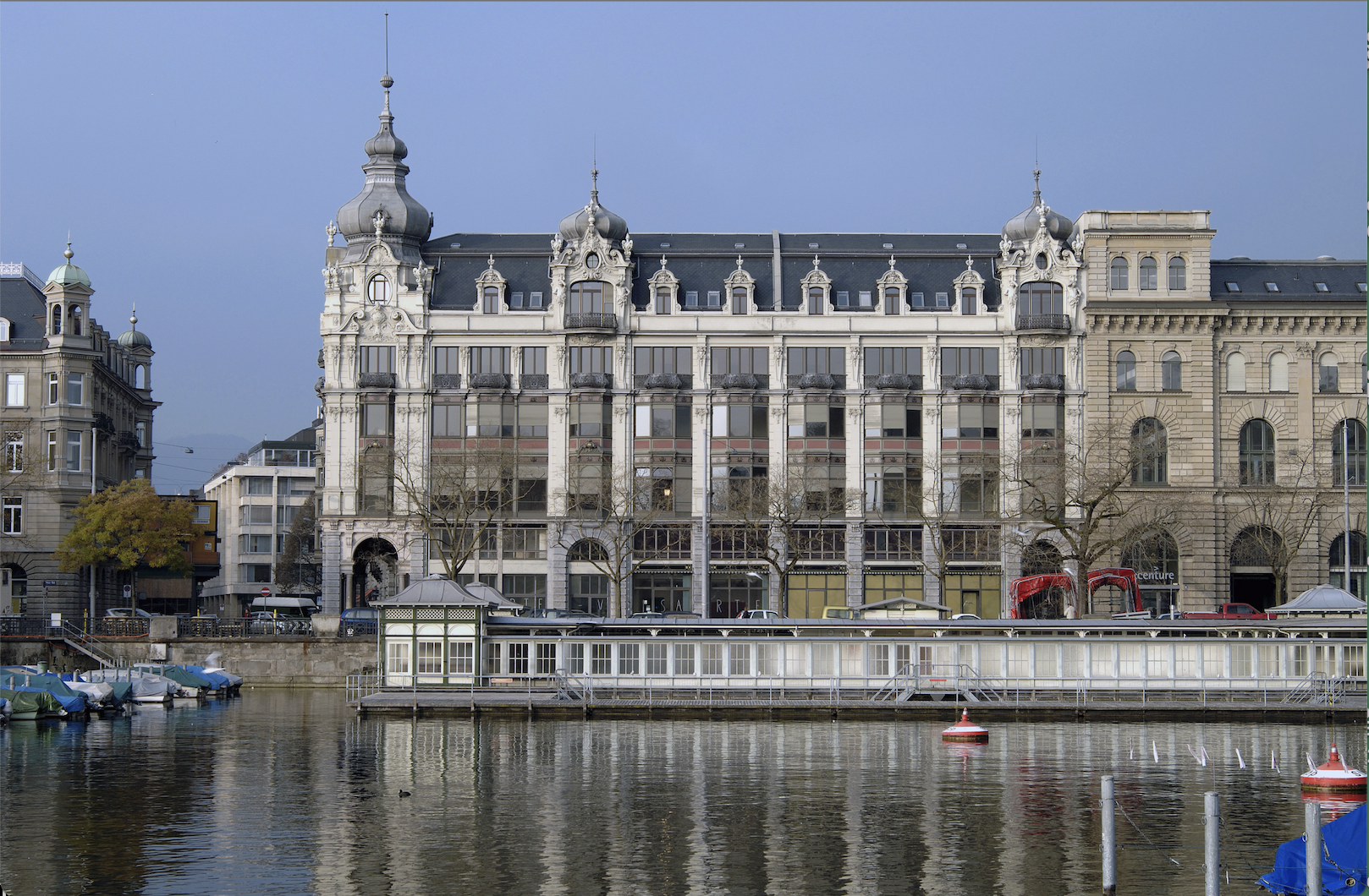 Mit dem Metropol erhielt Zürich das erste reine Geschäftshaus. Auch das Geschenk an das Stadtbild mit der interessanten Höhenteiligkeit der Fassade und deren Bekrönung mit den Rokoko-Türmen ist gross. Von unten nach oben: das Doppelpaket von Erdgeschoss plus Mezzanin, dann die drei Büroetagen mit Erkern oder Balkonen und als oberen Abschluss ein Dachgeschoss mit den Rokoko-Türmen. Die lebhafte Dachsilhouette sorgt für die Fernwirkung des Gebäudes und bereichert das Stadtbild. Dank der Abschrägungen der Erker, gibt es immer Fenster, die spiegeln. Auf dem Foto (SPPA Architekten) deutet die spiegelnde Seeseite der Erker auf eine Morgenstunde.