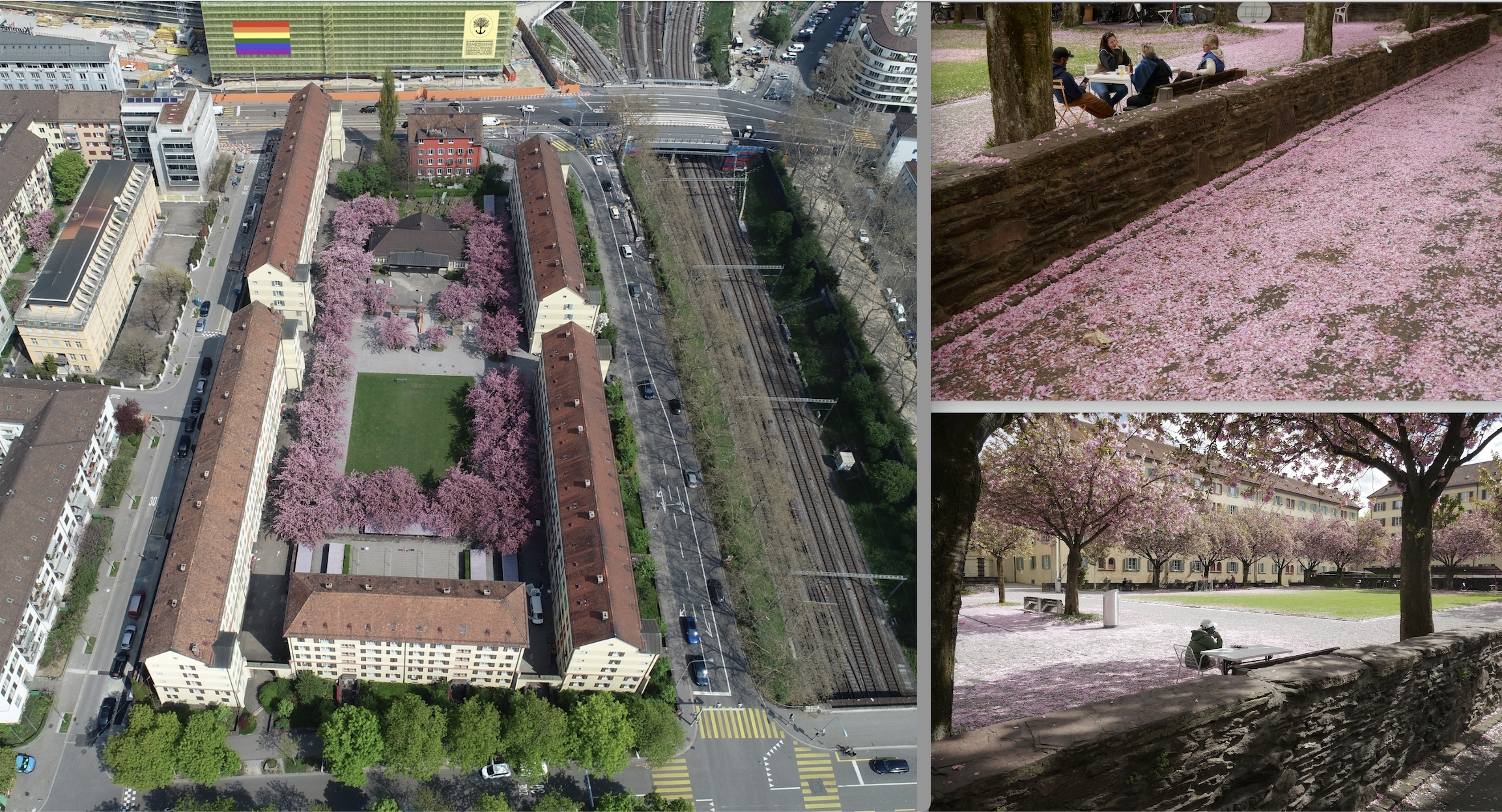 Die Frühlingsbilder unterstreichen die Kraft der an fünf Stellen mit Torbauten zusammengeschlossenen Hofbebauung. Von Kirschbäumen begleitete Längsmauern scheiden die Wege von den grosszügigen Aufenthaltsflächen in der Mitte. Ein Velounterstand und ein Kindergartengebäude finden sich an den beiden Enden. Das Holz für die Kachelöfen kommt heutzutage vom Grossverteiler beim Lochergut. Eine gute Idee, fand ein Bewohner: «Wir heizen sparsam und temporär und die Energie wächst nach».