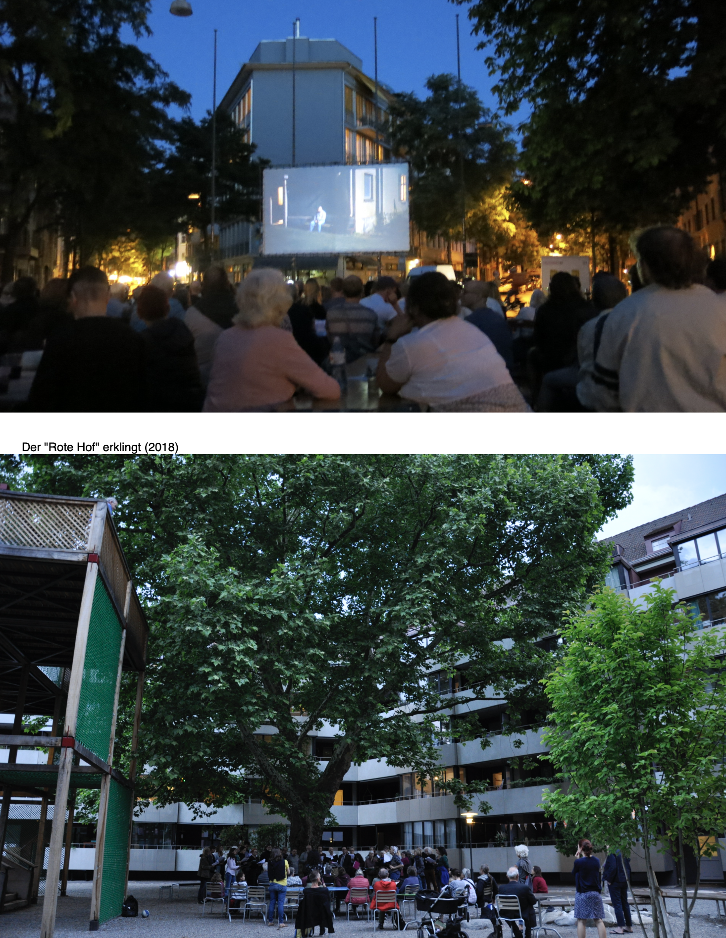 Zurück zum 1920 erbauten Roten Block: Nach aussen wirkt die strenge Form zwischen zwei Strassenstrahlen am Platz, nach innen der dreieckige Hof. 1980 beginnt die Kaskade der Verbesserungen. Nach Feststellung einer Frequenz von täglich 14’000 Autos, brachte die Sperrung der Durchfahrt über den Röntgenplatz einen Quartierplatz in der Mitte des Strassensterns. 2015 verbesserte die Genossenschaft mit einer hofseitigen umlaufenden Raumschicht die Grundrisse aller Wohnungen. Man sagte noch «B» mit einer mehrstöckigen Pergola in einem Teil des Hofes. Heute steht der ehemals strenge, disziplinierende und 10 Gebäude umfassende Blockwinkel auch in sozialer Hinsicht prächtig da. Im Vorgelände der Platz mit Regenpavillon und im Innenhof die geschützten Freiräume mit der Pergola.